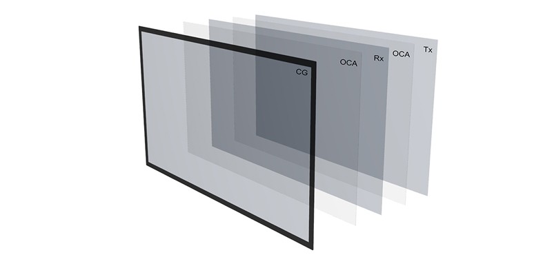 例如我司產品采用的是金屬網格GFF的貼合方式,表層是玻璃,底部是光學膠+Rx電極和光學膠+Tx電極貼合而成。