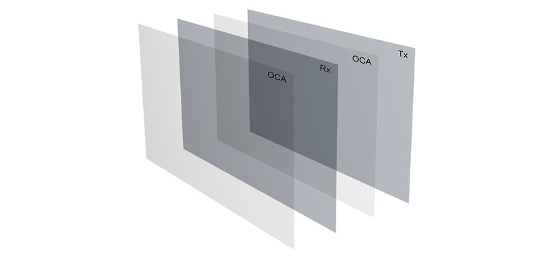 例如我司產品采用的是金屬網格FF的貼合方式,由光學膠+Rx電極和光學膠+Tx電極貼合而成。